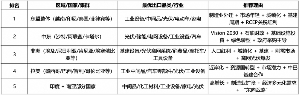 以下是我评估出的几大”2026-2030年中国出口高弹性增长市场”(按机会+增速+稳定性排序),特别推荐”东盟+中东+拉美”这三大区域,它们构成了中国出口增长最可靠、弹性最高、周期最长的”三驾马车”。
