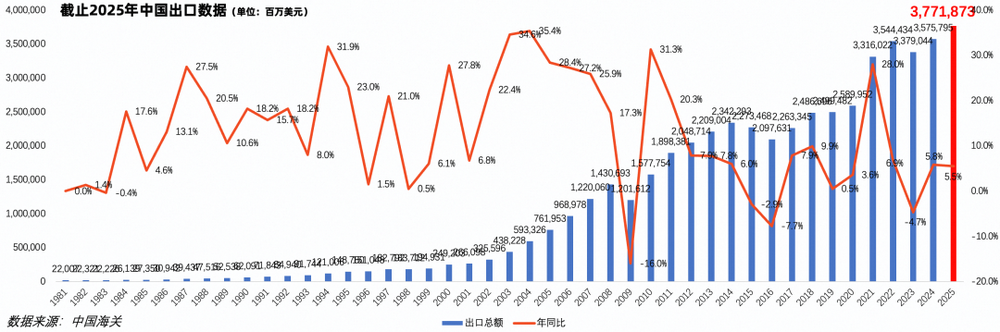 正式写2026年贸易机会前,先回顾下2025年中国出口数据情况:等了这么多天,海关终于公布了2025年全年的中国出口数据,2025年全年出口额美元计3.77万亿美元,同比增长5.5%,虽然较2024年增速回落0.3pt,但整体韧性十足,顺差达1.2万亿美元,同比增加20%达到1,974亿美元。就全年而言:AI投资周期带动能源基础设施需求持续上行,产业链升级强化高端制造出口能力,而“一带一路”投资亦持续加速,有力的支撑了我国出口结构性增长。