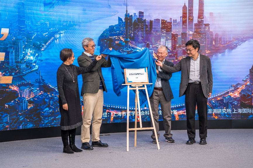 上海市工商联党组成员、副主席杨茜,上海国际问题研究院院长陈东晓,上海市宏观经济学会会长、上海市“十五五”规划专家咨询委员会专家王思政,上海报业集团副社长、澎湃新闻党委书记、董事长杨健(从左到右)为全球商业品牌研究中心揭牌。本文图片均由 沙润琪 摄