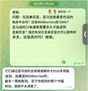 亚马逊在亚美尼亚的用户规模较小,但用户群体高度集中,主要是教授、专业人士等高知群体,核心需求是商品品质和售后保障。舞蹈课群里的女士就通过亚马逊购买体操服和舞蹈鞋;访谈中的多位教授也表示会使用亚马逊。我了解到,亚马逊通过全球速递服务配送至亚美尼亚,时效约20天,相对稳定,但价格偏高。这一平台的存在,填补了当地对高品质商品的需求空白,与TEMU的低价定位、WB的日常消费定位形成互补。不过多数我访谈的本地亚美尼亚年轻女孩虽知道亚马逊,但并未使用过,说明其受众覆盖面有限。