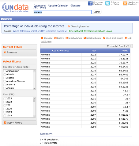 图4 UNdata数据显示亚美尼亚个人互联网使用普及率从2014年的54.6%提升到2022年的77%