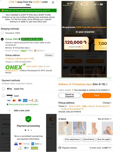 TEMU是近年来亚美尼亚电商市场的“黑马”,热度和送货速度有超过两家俄系平台的趋势。其核心竞争力是低价和接地气的运营模式,这让它成为年轻人的首选——18-20岁的亚美尼亚女孩明确表示“主要用TEMU”,认为WB价格偏高;28岁的俄罗斯裔居民也更喜欢TEMU,因为其不仅便宜,还经常赠送小礼物。我个人体验发现,TEMU界面为英文,对年轻人操作友好,还有“满8000德拉姆免运费(初次购买满4000德拉姆约80人民币即可)”“下单后规定时间内可追加商品同单配送”的政策,搭配砸金蛋、转转盘等小游戏,与国内拼多多的运营逻辑高度相似,很贴合年轻用户的消费习惯。